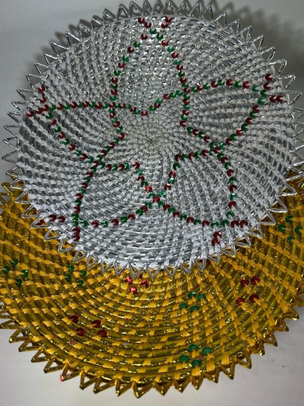 Elegant and traditional, this flat roti holder is handwoven from natural date palm leaves and finished in beautiful gold and silver tones. Its simple, open design makes it perfect for serving rotis, parathas, or naan in style.
