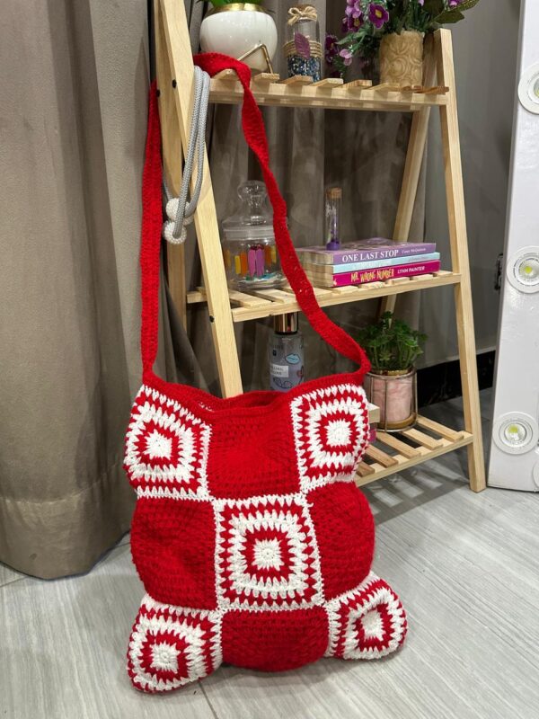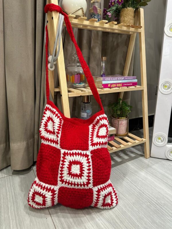 this crochet square pattern bag adds a splash of color and personality to any outfit.